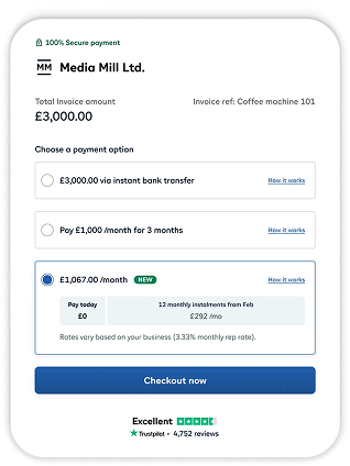 We accept iwocaPay to give trade customers more control when it comes to paying. iwocaPay is available for UK Limited Businesses and LLPs on orders of £150 to £30,000